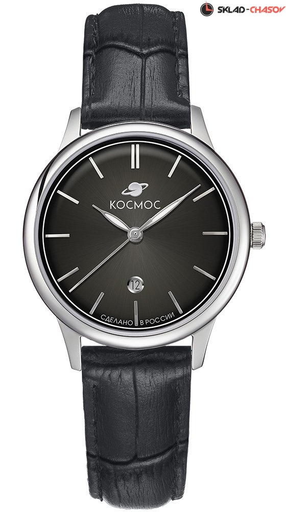 Кварцевые женские часы Космос созданы по канонам стиля «минимализм». На широком циферблате расположены часовая и минутная стрелки. Необычная секундная стрелка имеет выгнутую форму, как и сам циферблат. С первого взгляда обращает на себя внимание цветовой эффект градиента: черный цвет, насыщенный по краям, к центру постепенно светлеет. В позиции «6 часов» находится индикатор даты.