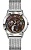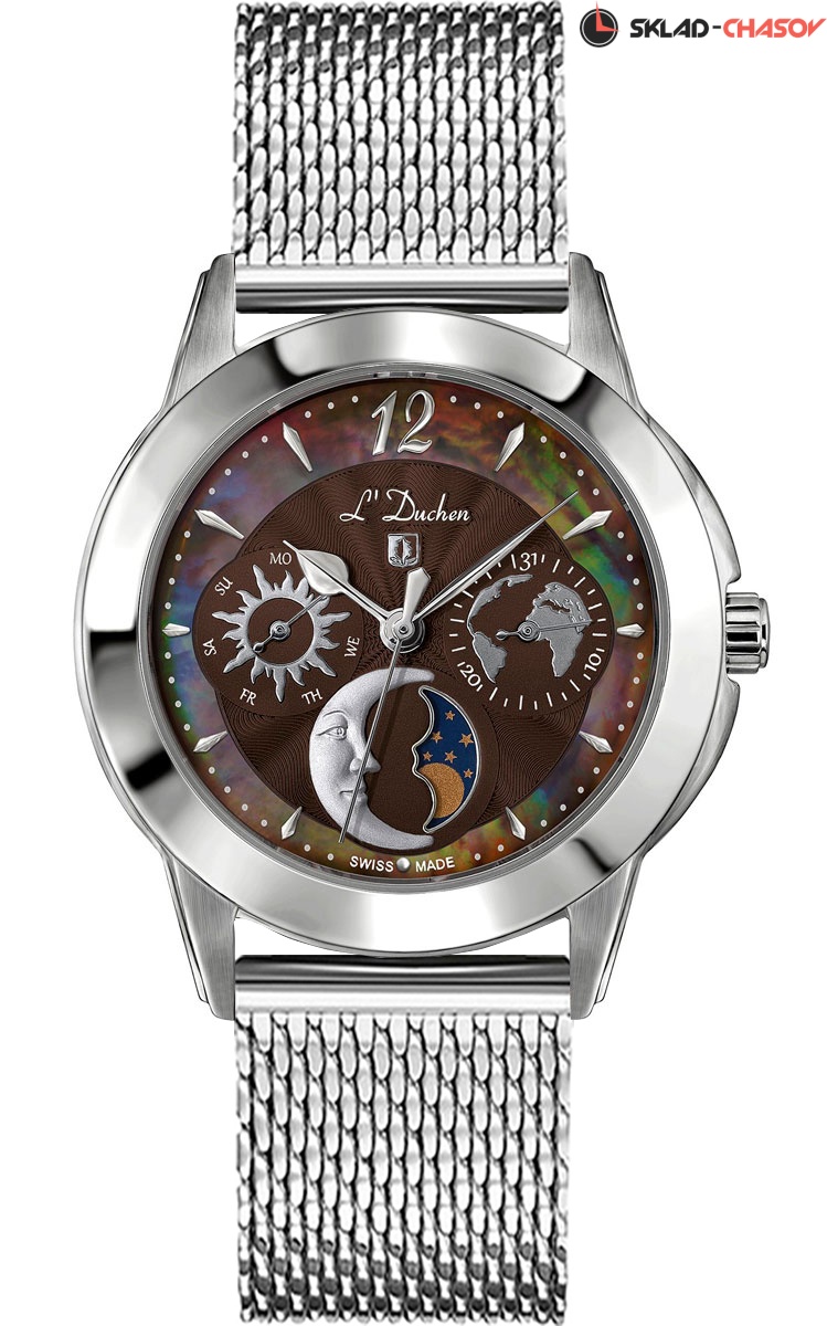 Кварцевый швейцарский механизм надежно скрыт в стальном корпусе круглой формы. Привлекает внимание сочетание матированных и полированных элементов на корпусе. Широкий полированный безель интересно играет на свету. Почти невидимое, но стойкое к появлению царапин, сапфировое стекло позволяет любоваться главной изюминкой модели — роскошным коричневым циферблатом. Центральная часть циферблата декорирована волнообразным гильоше. Индикатор дней недели представлен в виде солнечного диска, индикатор даты украшает изображение карты нашей планеты. Указатель лунных фаз элегантно выделен металлической рамкой и дополнен объемным элементом в виде месяца. И, конечно, неповторимость и уникальность часам придает кольцо из натурального перламутра по краю циферблата. День недели и месяц устанавливаются с помощью скрытой кнопки, которая находится сбоку на корпусе. Разработчики предусмотрительно расположили ее таким образом, чтобы механизм часов не был поврежден в результате случайного и некорректного использования кнопки.
