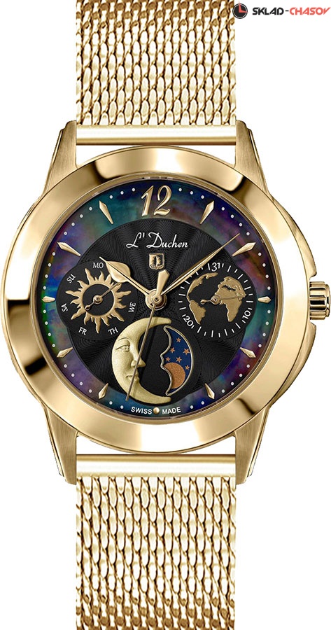 Кварцевый швейцарский механизм надежно скрыт в стальном корпусе с PVD-покрытием розового золота круглой формы. Привлекает внимание сочетание матированных и полированных элементов на корпусе. Широкий полированный безель интересно играет на свету. Почти невидимое, но стойкое к появлению царапин, сапфировое стекло позволяет любоваться главной изюминкой модели — роскошным белым циферблатом. Центральная часть циферблата декорирована волнообразным гильоше. Индикатор дней недели представлен в виде солнечного диска, индикатор даты украшает изображение карты нашей планеты. Указатель лунных фаз элегантно выделен металлической рамкой и дополнен объемным элементом в виде месяца. И, конечно, неповторимость и уникальность часам придает кольцо из натурального перламутра по краю циферблата. День недели и месяц устанавливаются с помощью скрытой кнопки, которая находится сбоку на корпусе. Разработчики предусмотрительно расположили ее таким образом, чтобы механизм часов не был поврежден в результате случайного и некорректного использования кнопки.