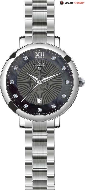Женские кварцевые часы. Швейцарский механизм Ronda. Центральные часовая, минутная и секундная стрелки. Апертура даты в позиции 6 часов. Черный перламутровый циферблат украшен кристаллами в местах часовых меток. Корпус выполнен из полированной нержавеющей стали. Диаметр корпуса составляет 32 мм. Стальной браслет с полированными и матовыми звеньями, раскладывающаяся застежка. Устойчивое к возникновению царапин сапфировое стекло. Водостойкость WR 50 (мытье рук, дождь).