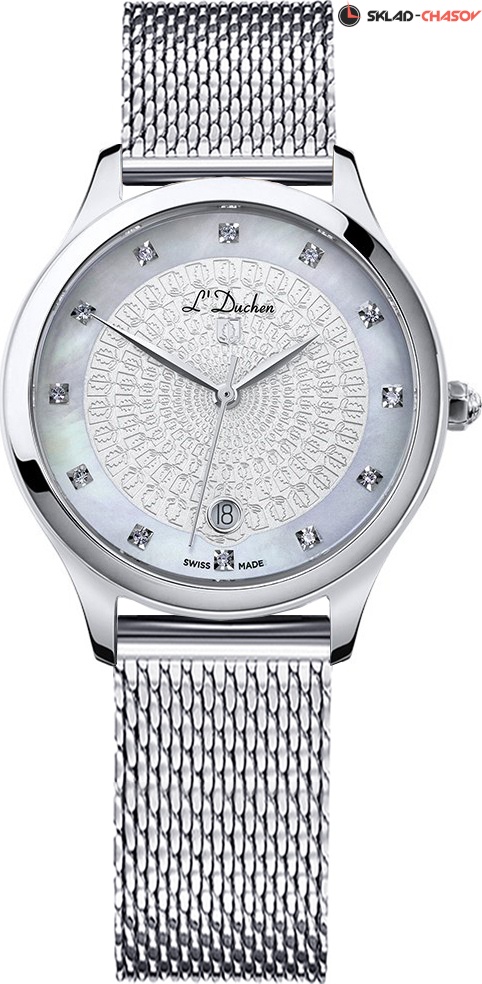 Изящная модель женских часиков, которая одинаково элегантно будет дополнять как вечерний, так и повседневный образ. Grace. Женские часы с круглым стальным корпусом. Циферблат декорирован узором гильоше «дубовый лист», который является логотипом компании L Duchen и олицетворяет мудрость и долговечность. Метки в виде точек. Окошко даты находится в положении 6 часов. Граненая заводная головка. Удобный и надежный стальной миланский браслет.