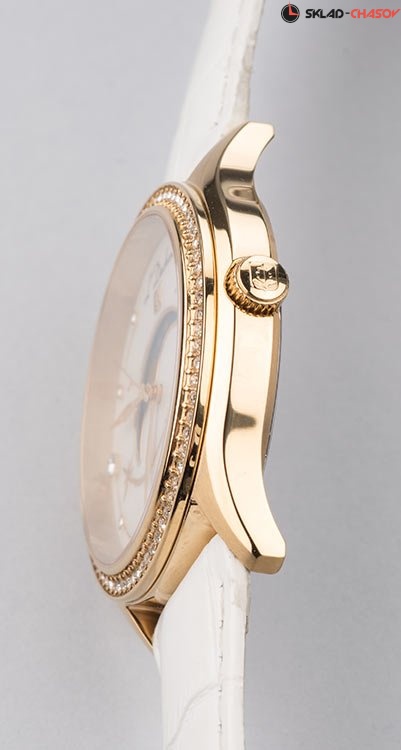 • Циферблат выполнен из перламутра. Объемные накладные элементы оформления. Инкрустация цирконами в качестве часовых индексов.