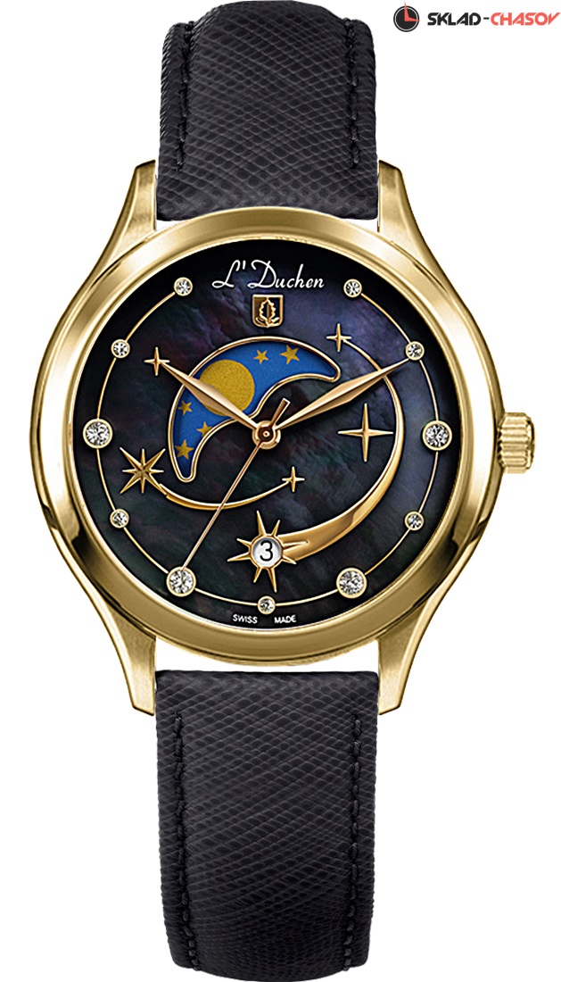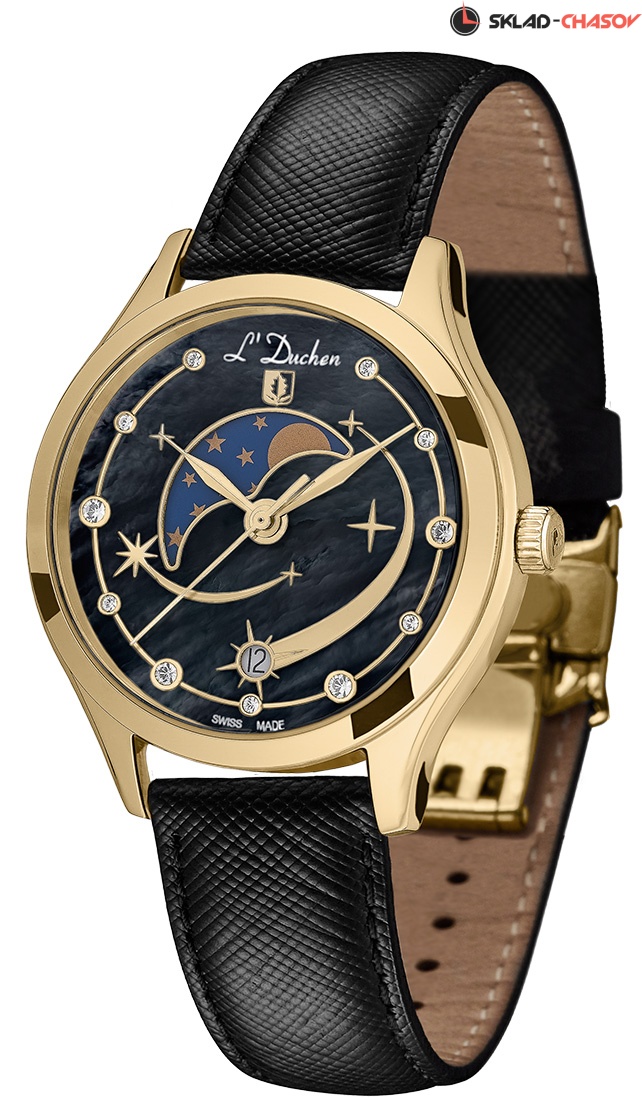 В часах используется швейцарский кварцевый механизм Ronda. Корпус часов из гипоаллергенной нержавеющей стали с PVD-покрытием из желтого золота. Эффектно смотрится чередование матовых и полированных частей. Дополняет модель ремешок черного цвета из натуральной кожи и стальной раскладной застежкой- «бабочкой».