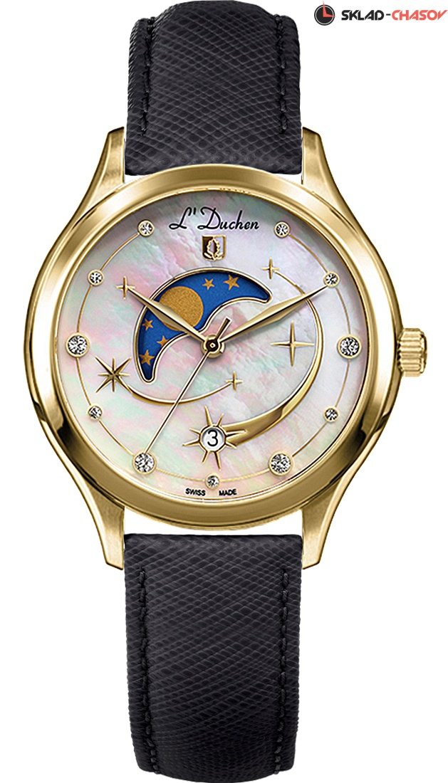 В часах используется швейцарский кварцевый механизм Ronda. Корпус часов из гипоаллергенной нержавеющей стали с PVD-покрытием из желтого золота. Эффектно смотрится чередование матовых и полированных частей. Дополняет модель ремешок черного цвета из натуральной кожи и стальной раскладной застежкой- «бабочкой».