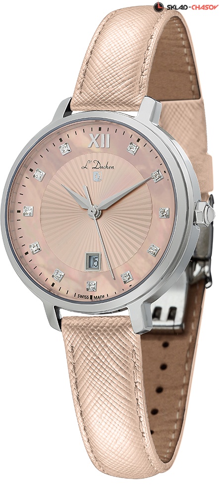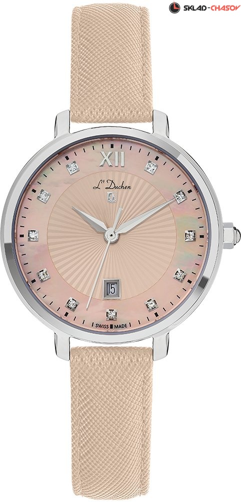 Женские кварцевые часы. Швейцарский механизм Ronda. Центральные часовая, минутная и секундная стрелки. Апертура даты в позиции 6 часов. Черный перламутровый циферблат украшен кристаллами в местах часовых меток. Корпус выполнен из полированной нержавеющей стали. Диаметр корпуса составляет 32 мм. Кожанный ремешок. Устойчивое к возникновению царапин сапфировое стекло. Водостойкость WR 50 (мытье рук, дождь).