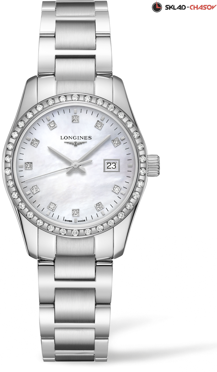 Женская кварцевая модель. Безель украшен 34 бриллиантами. 11 бриллиантов на перламутровым циферблате. Расположение даты в районе 3 часов.