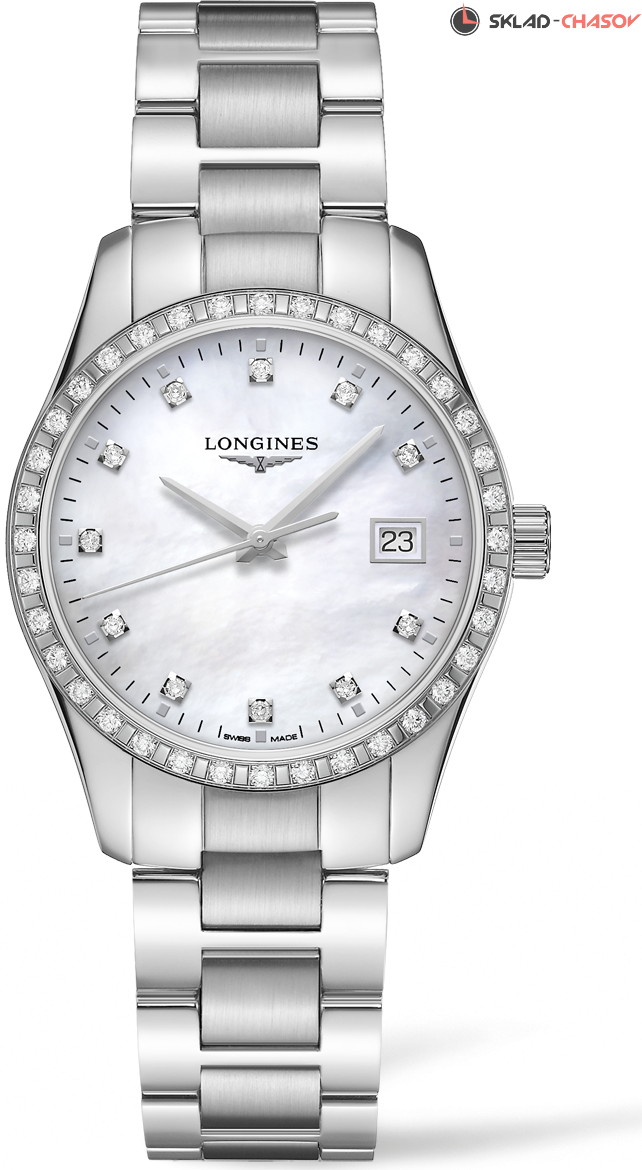 Женская кварцевая модель. Безель украшен 36 бриллиантами. 11 бриллиантов на перламутровом циферблате. Расположение даты в районе 3 часов.