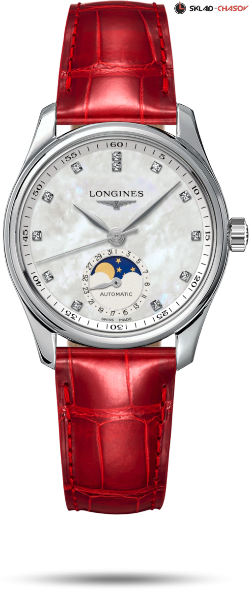 Женская модель, циферблат украшен 12 бриллиантами группы Top Wesselton VS-SI общим весом 0.055 карата, индикация даты в положении 6 часов, индикатор фазы луны в положении 6 часов, прозрачная задняя крышка.
