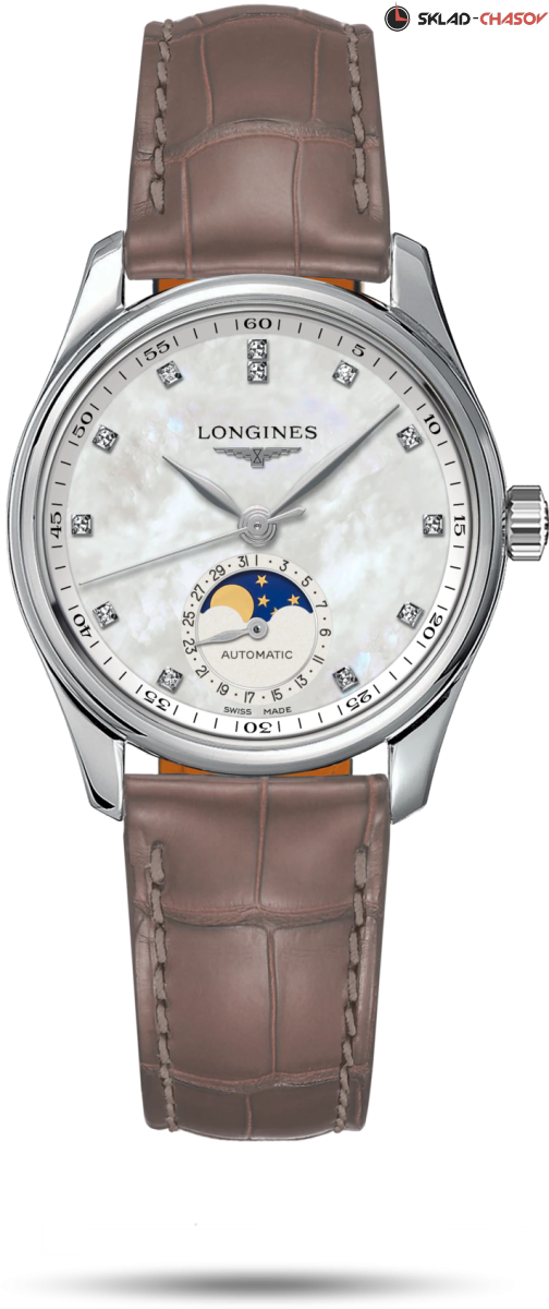 Женская модель, циферблат украшен 12 бриллиантами группы Top Wesselton VS-SI общим весом 0.055 карата, индикация даты в положении 6 часов, индикатор фазы луны в положении 6 часов, прозрачная задняя крышка.