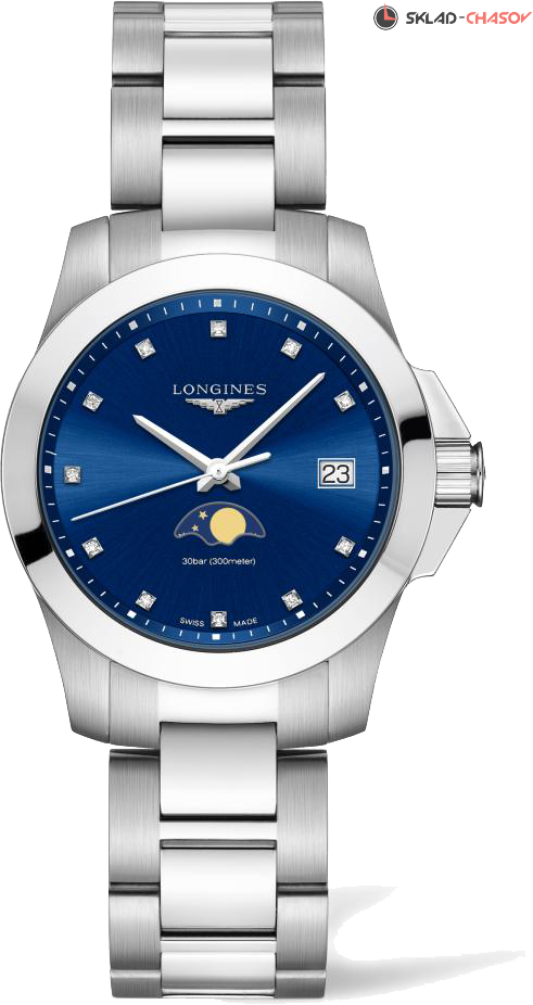 Женская спортивная модель, окошко даты в положении 3 часа, завинчивающаяся заводная коронка. В положении 6 часов фазы луны. Циферблат украшен бриллиантами.