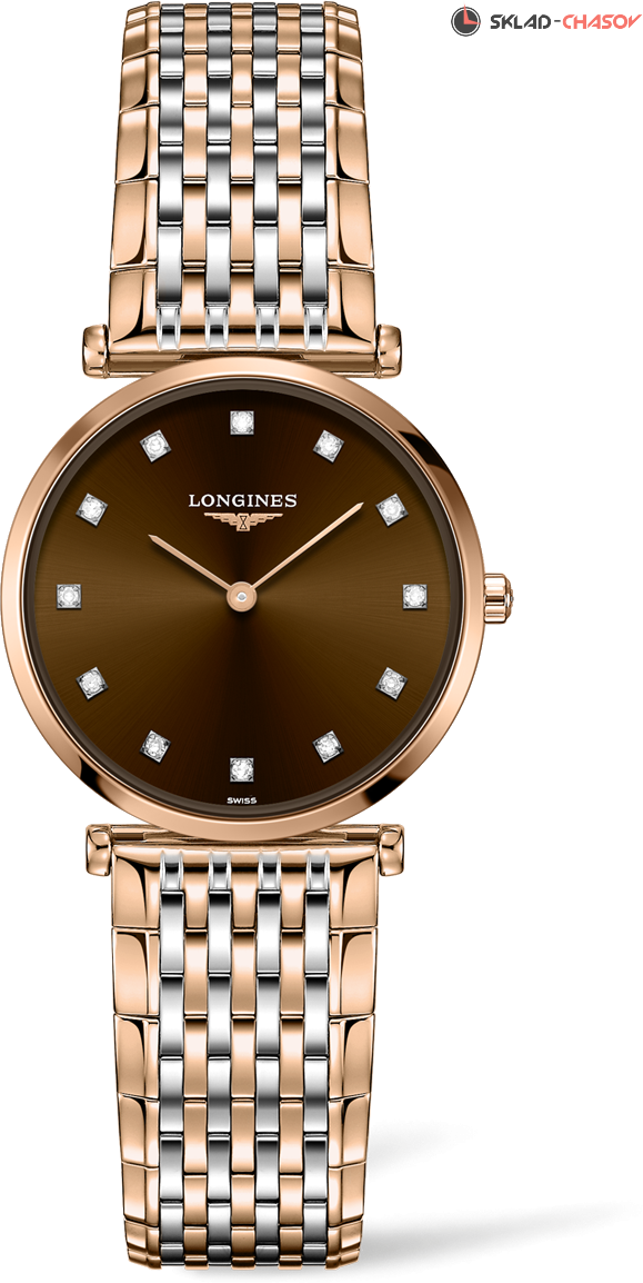 La Grande Classique — символ классической элегантности и совершенства часов Longines. Характерными особенностями коллекции являются тонкий корпус и большое разнообразие версий. Выразительная и классическая женская кварцевая модель, индикация часов и минут центральными стрелками, 12 бриллиантов на циферблате ( 0.081 ct)
