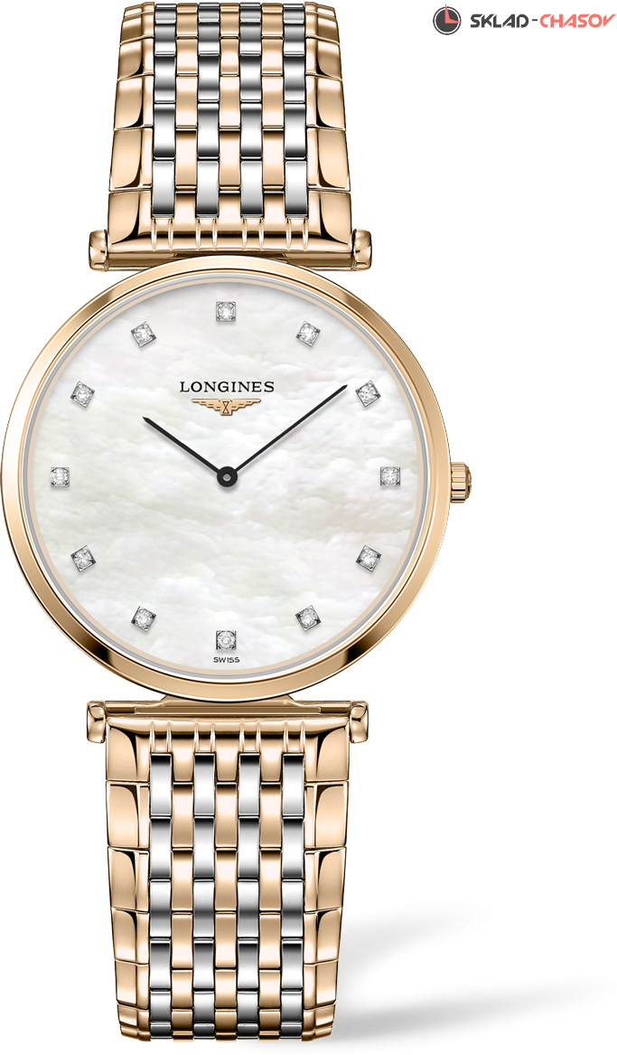 La Grande Classique — символ классической элегантности и совершенства часов Longines. Характерными особенностями коллекции являются тонкий корпус и большое разнообразие версий. Выразительная и классическая женская кварцевая модель, индикация часов и минут центральными стрелками, 12 бриллиантов на циферблате (0.081 ct)