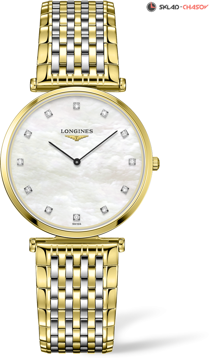 La Grande Classique — символ классической элегантности и совершенства часов Longines. Характерными особенностями коллекции являются тонкий корпус и большое разнообразие версий. Выразительная и классическая женская кварцевая модель, индикация часов и минут центральными стрелками, 12 бриллиантов на циферблате (0.081 ct)