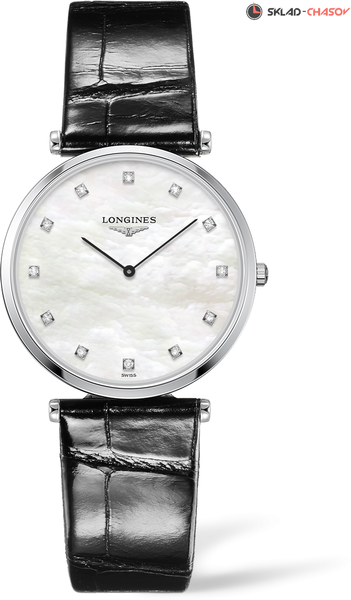 La Grande Classique — символ классической элегантности и совершенства часов Longines. Характерными особенностями коллекции являются тонкий корпус и большое разнообразие версий. Выразительная и классическая женская кварцевая модель, индикация часов и минут центральными стрелками, 12 бриллиантов на циферблате (0.081 ct)