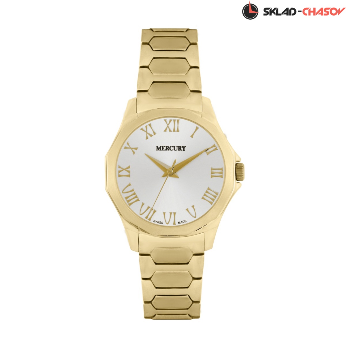 Кварцевые Женские часы Mercury, коллекция Dodegone (MEL461-GG-1), производство ШВЕЙЦАРИЯ, диаметр - 32 мм, материал корпуса - Желтый PVD, Браслет, материал браслета - Желтый PVD, циферблат - Серебристый, Римские цифры