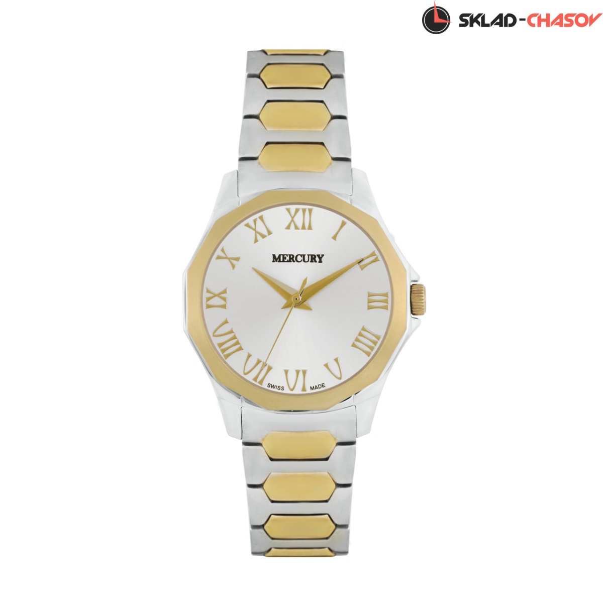 Кварцевые Женские часы Mercury, коллекция Dodegone (MEL461-SG-1), производство ШВЕЙЦАРИЯ, диаметр - 32 мм, материал корпуса - Сталь и Желтый PVD, Браслет, материал браслета - Сталь и Желтый PVD, циферблат - Серебристый, Римские цифры