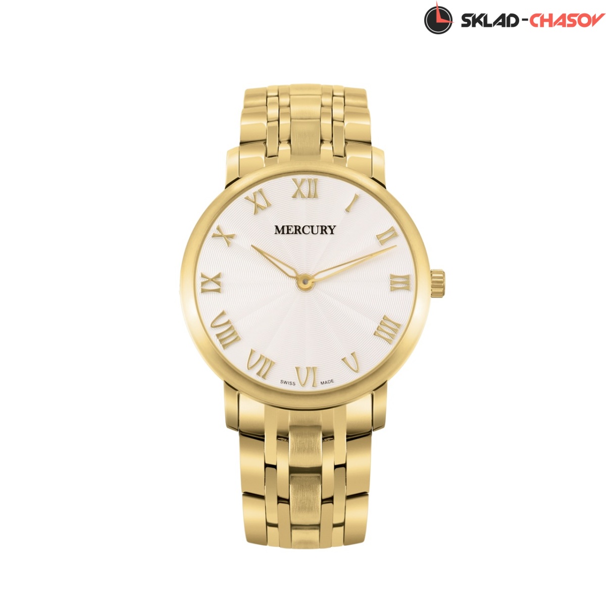 Кварцевые Женские часы Mercury (ME400-GG-1), производство ШВЕЙЦАРИЯ, диаметр - 32 мм, материал корпуса - Желтый PVD, Браслет, материал браслета - Желтый PVD, циферблат - Серебристый, Римские цифры