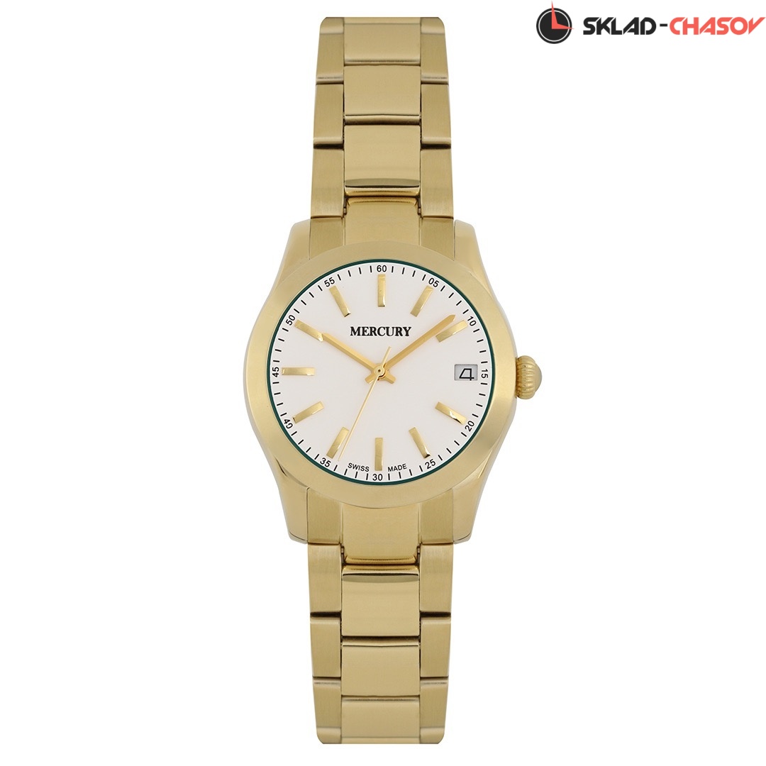 Кварцевые Женские часы Mercury (MEL468-GG-1), производство ШВЕЙЦАРИЯ, диаметр - 31 мм, материал корпуса - Желтый PVD, Браслет, материал браслета - Желтый PVD, циферблат - Серебристый, Метки, Дата