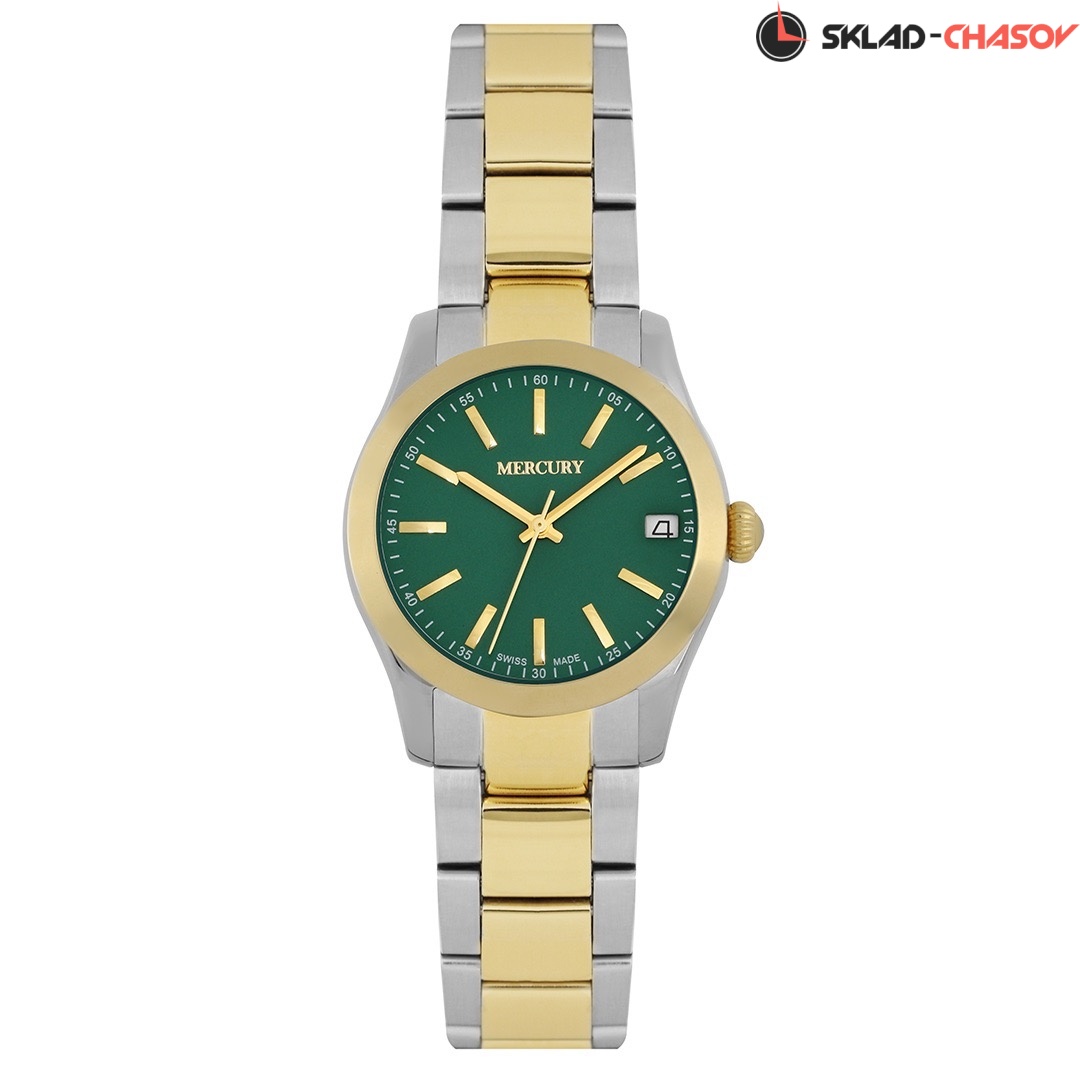 Кварцевые Женские часы Mercury (MEL468-SG-12), производство ШВЕЙЦАРИЯ, диаметр - 31 мм, материал корпуса - Сталь и Желтый PVD, Браслет, материал браслета - Сталь и Желтый PVD, циферблат - Зеленый, Метки, Дата