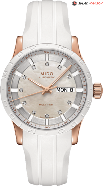 Женские часы. Индикация часов, минут, секунд центральными стрелками. Окошко даты и дня недели в положении 3 часа. Безель с гравировкой бренда.