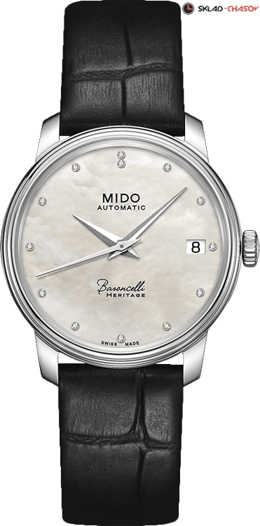 Классическая женская модель на все случаи жизни. Лаконичный циферблат выполнен из натурального перламутра и украшен бриллиантами. Индикация часов, минут, секунд. Апертура даты в положении 3 часа.