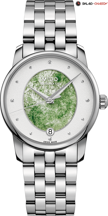 Оригинальные женские часы удивляют своими великолепными циферблатами, где используются натуральные камни - авантюрин, тигровый глаз, малахит или древесная яшма. Апертура даты в положении 6 часов.