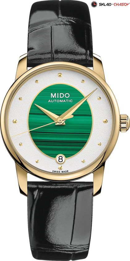 Оригинальные женские часы удивляют своими великолепными циферблатами, где используются натуральные камни - авантюрин, тигровый глаз, малахит или древесная яшма. Апертура даты в положении 6 часов.