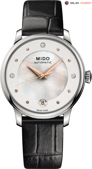 Эти часы для истинных леди предлагаются с тремя съемными ремешками Mido. Гармоничные линии, перламутровый циферблат и бриллиантовая отделка превращают их в аксессуар, идеально завершающий дневной или вечерний образ. Автоматический механизм оснащен указателем даты и обладает запасом хода до 80 часов.