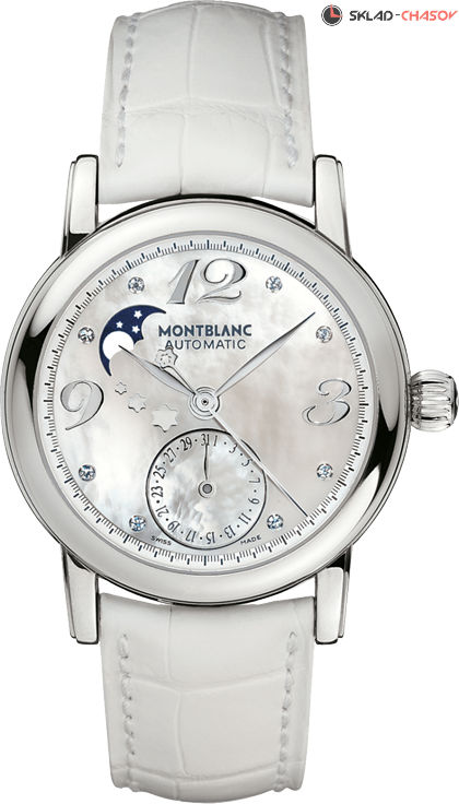 Перламутровый циферблат украшен 8 бриллиантами общим весом 0.032 ct, индикация даты в положении 6 часов, индикация фазы луны в положении 10-11 часов