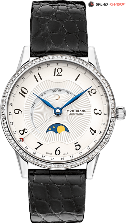 Женская модель, индикатор фазы луны в положении 6 часов, индикация даты отдельной центральной стрелкой, корпус часов украшен 78 бриллиантами общим весом 0.555 ct