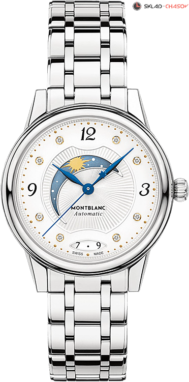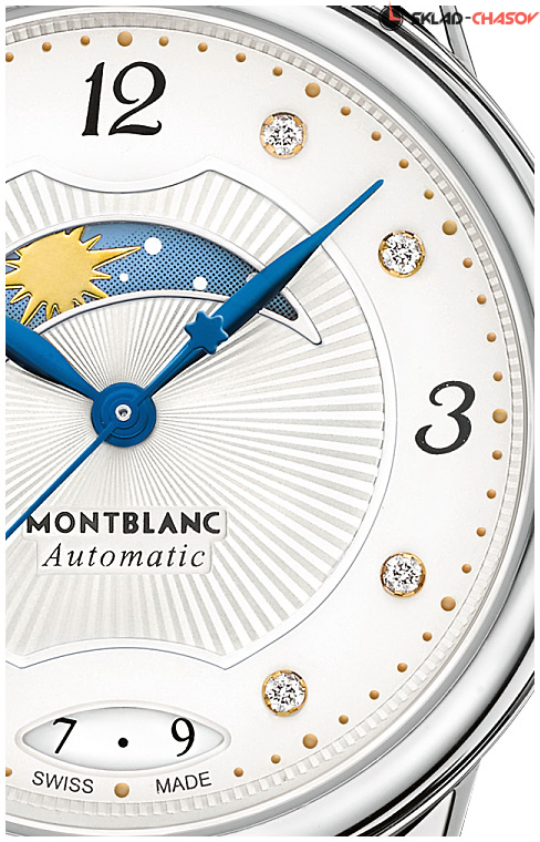 Элегантная жеская модель, индикация даты в положении 6 часов, индикация день/ночь в положении 10 часов, циферблат украшен 8 бриллиантами