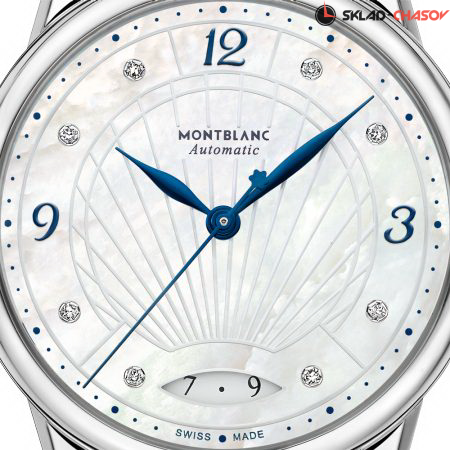 Элегантная женская модель с индикацией даты. Циферблат украшен 8 бриллиантами.