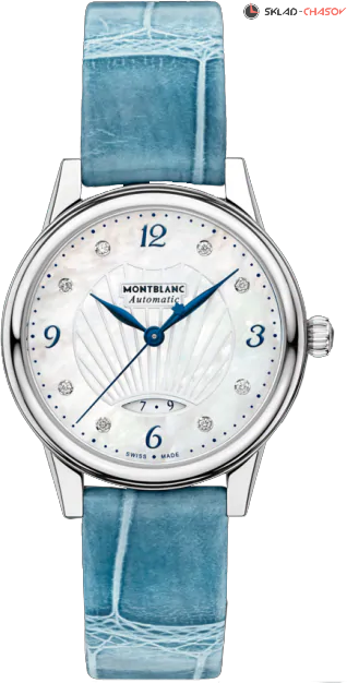 Элегантная женская модель с индикацией даты. Циферблат украшен 8 бриллиантами.