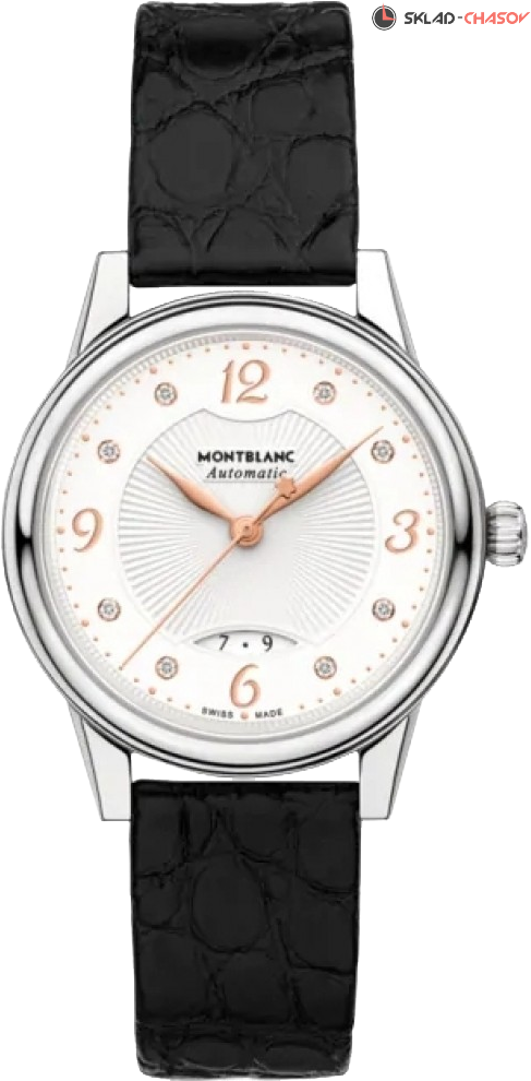 Элегантная женская модель с индикацией даты. Циферблат украшен 8 бриллиантами.