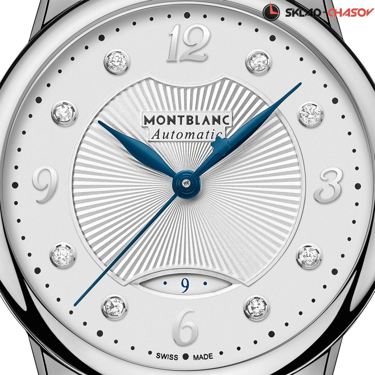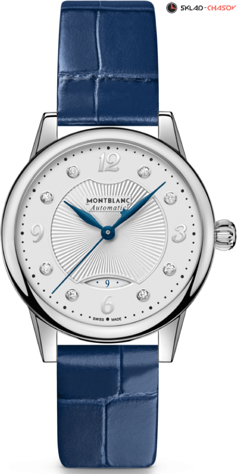 Элегантная женская модель с индикацией даты. Циферблат украшен 8 бриллиантами.