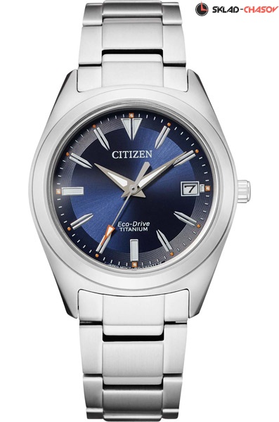 Титановые женские кварцевые часы на солнечной батарее Citizen коллекции Eco-Drive Titanium. Корпус и браслет изготовлены из легкого титана (Super Titanium 53) со специальным ионным покрытием, которое защищает материал от появления царапин. Калибр механизма — J810. Аккумулятор данной модели заряжается от любого источника света. Срок работы аккумулятора с полным зарядом — до 240 дней. Примерный срок службы аккумулятора — 10 лет. Присутствует функция информирования о недостаточном заряде. На круглом циферблате синего цвета отображается дата (только число), установлено минеральное стекло. Вместо цифр - метки в виде штрихов и точек с люминесцентным напылением (светятся в темноте). Водонепроницаемость WR50 (5 атм).