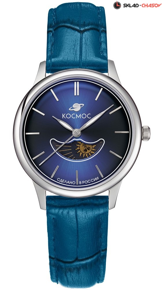 Элегантные женские часы серии Солнце и Луна отличаются наличием характерной функции день / ночь. Синий циферблат выполнен в ретро стиле, края его выгнуты, для чего требуется использование сложной технологии в производстве. Циферблаты такой формы создавали в часах прошлых лет. Кончик секундной стрелки выгнут по форме циферблата. На выпуклом градиентном циферблате выполнена шлифовка в стиле солнечных лучей и размещены изготовленные вручную индексы, которые крепятся на двух штифтах. На часовую, минутную стрелки, круг по окантовке циферблата, напоминающую ореол по краю Земли, и линию вокруг индикатора день/ночь нанесено люминесцентное покрытие, которое светится в темноте, создавая необычное изображение.