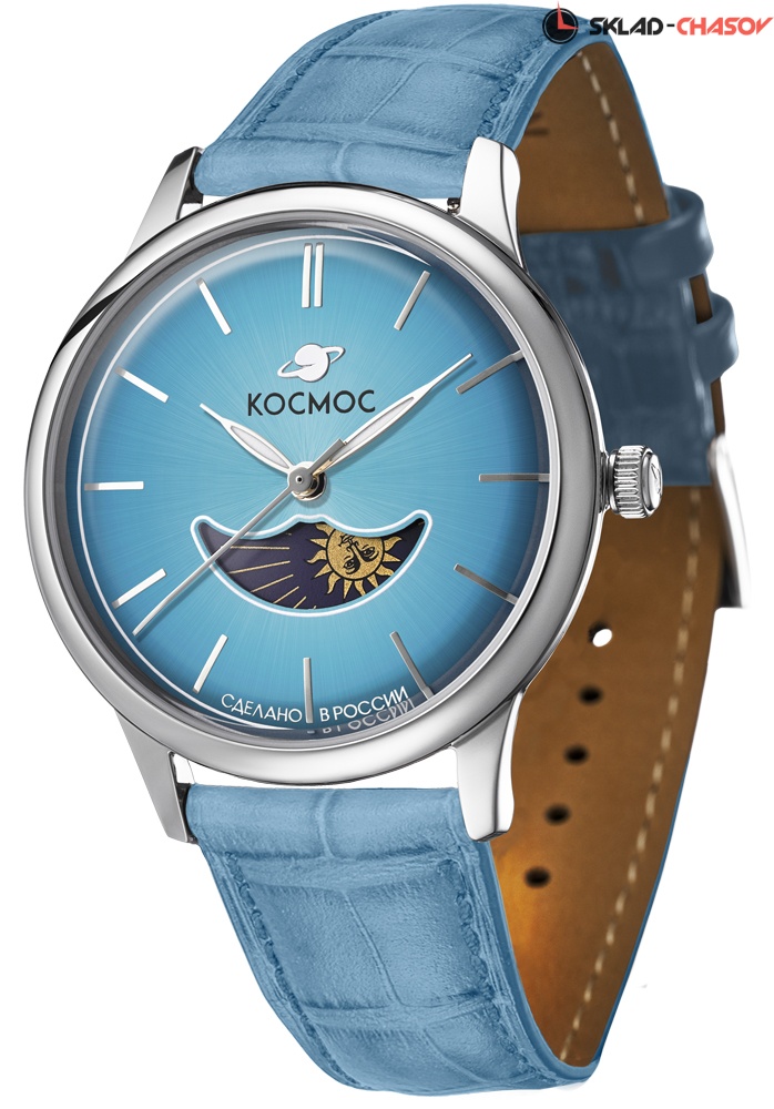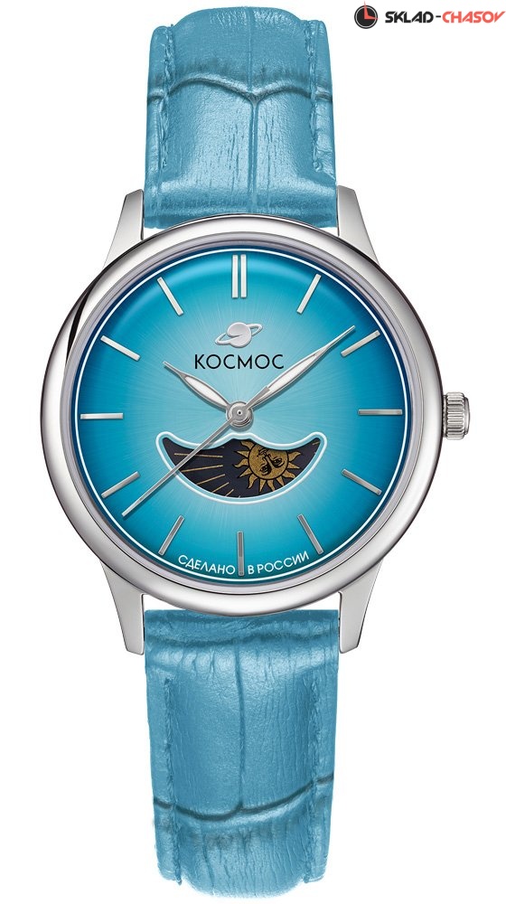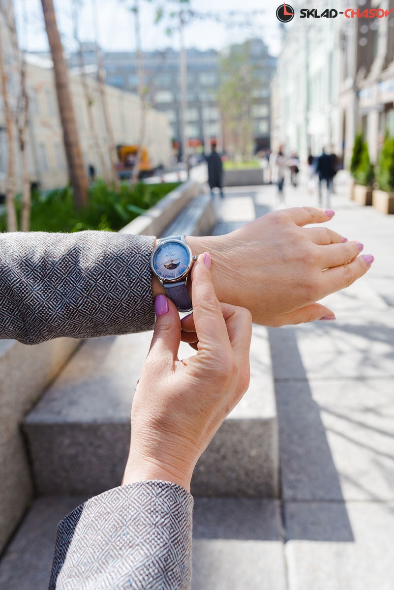 Элегантные женские часы серии Солнце и Луна отличаются наличием характерной функции день / ночь. Голубой циферблат выполнен в ретро стиле, края его выгнуты, для чего требуется использование сложной технологии в производстве. Циферблаты такой формы создавали в часах прошлых лет. Кончик секундной стрелки выгнут по форме циферблата. На выпуклом градиентном циферблате выполнена шлифовка в стиле солнечных лучей и размещены изготовленные вручную индексы, которые крепятся на двух штифтах. На часовую, минутную стрелки, круг по окантовке циферблата, напоминающую ореол по краю Земли, и линию вокруг индикатора день/ночь нанесено люминесцентное покрытие, которое светится в темноте, создавая необычное изображение.