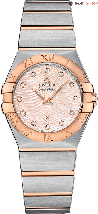 Необычный и запоминающийся дизайн этой коллекции проверен временем. Перламутровый циферблат выполнен с узором перьями и 11 бриллиантами общим весом 0.12 ct, безель из 18-каратного розового золота украшают выгравированные римские цифры. Хронометр C.O.S.C., индикация даты, прозрачная задняя крышка.