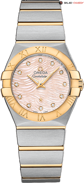 Необычный и запоминающийся дизайн этой коллекции проверен временем. Перламутровый циферблат выполнен с узором перьями и 11 бриллиантами общим весом 0.12 ct, безель из 18-каратного жёлтого золота украшают выгравированные римские цифры. Хронометр C.O.S.C., индикация даты, прозрачная задняя крышка.