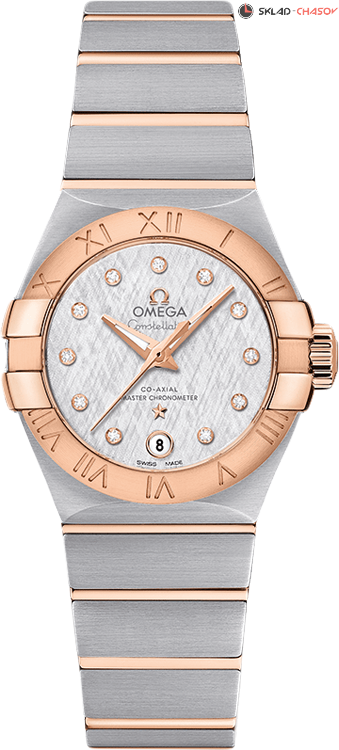 Необычный и запоминающийся дизайн этой коллекции проверен временем. Циферблат выполнен с шелковым узором и украшен 11 бриллиантами, безель с выгравированными римскими цифрами. Хронометр METAS, индикация даты, прозрачная задняя крышка.