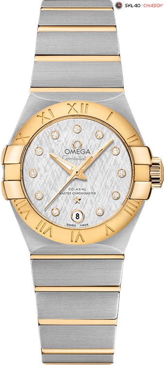 Необычный и запоминающийся дизайн этой коллекции проверен временем. Циферблат выполнен с шелковым узором и украшен 11 бриллиантами, безель с выгравированными римскими цифрами. Хронометр METAS, индикация даты, прозрачная задняя крышка.