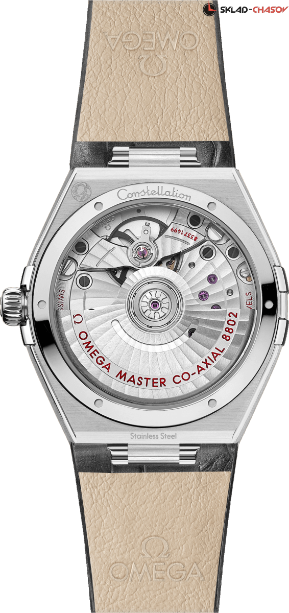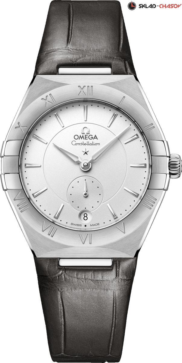 Драматичный и неизменный дизайн часов OMEGA Constellation характеризуется знаменитыми гранями в виде полумесяца, а также «скобами» на боковых сторонах корпуса. Эта 34-миллиметровая модель из нержавеющей стали оснащена безелем с выгравированными римскими цифрами, кристально белым серебристым циферблатом и круглым окошком даты в положении «6 часов». Полированные часовые индексы, стрелки, логотип OMEGA и звезда Constellation выполнены из белого золота 18 карат, а малый секундный циферблат и центральная минутная дорожка обведены кольцами. Часы, представленные на сером кожаном ремешке, приводятся в движение коаксиальным хронометром OMEGA Master Chronometer Calibre 8802, который виден через куполообразное сапфировое стекло, устойчивое к царапинам.