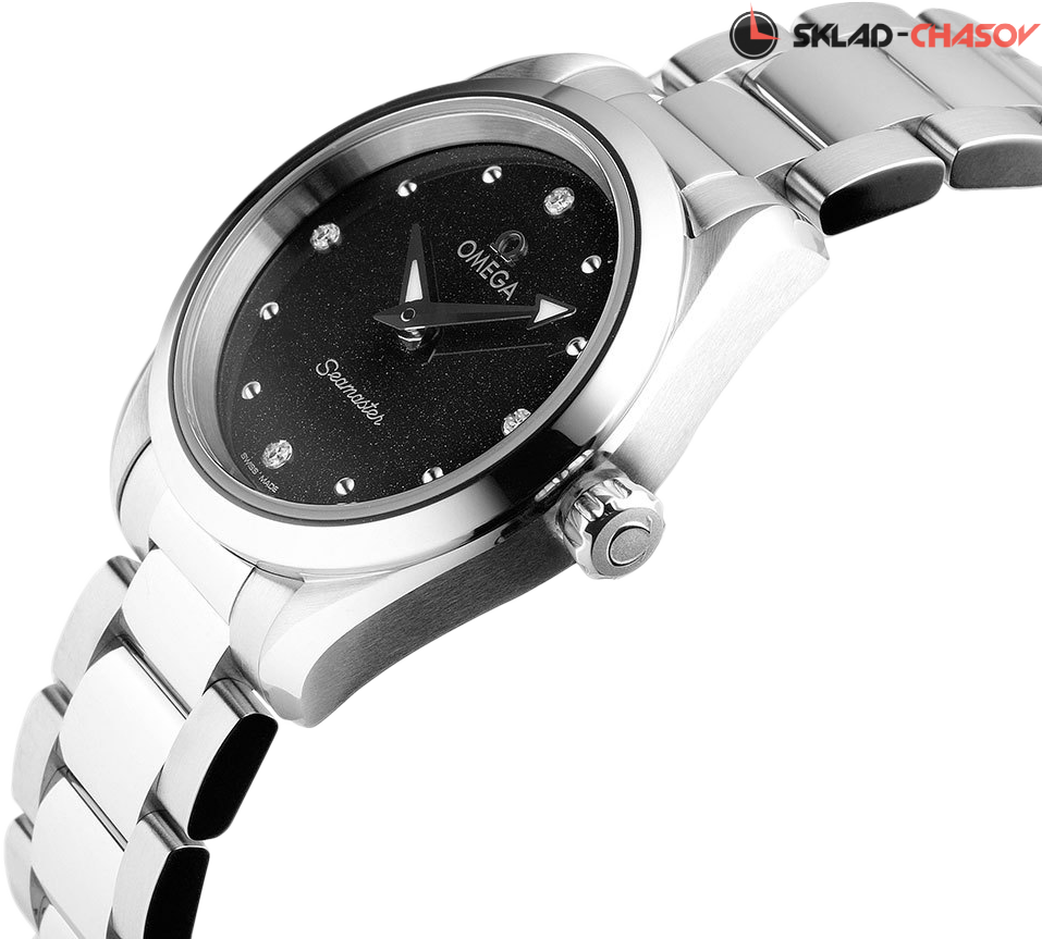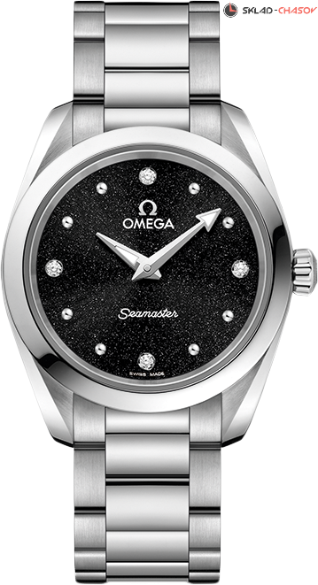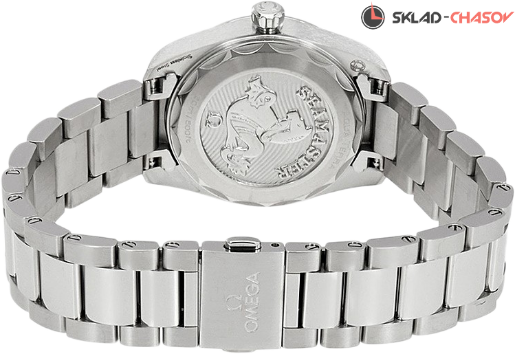 Элегантная женская модель, циферблат украшен 4 бриллиантами, задняя крышка с тисненым изображением морского конька OMEGA на фоне волн.