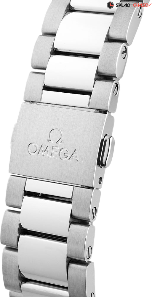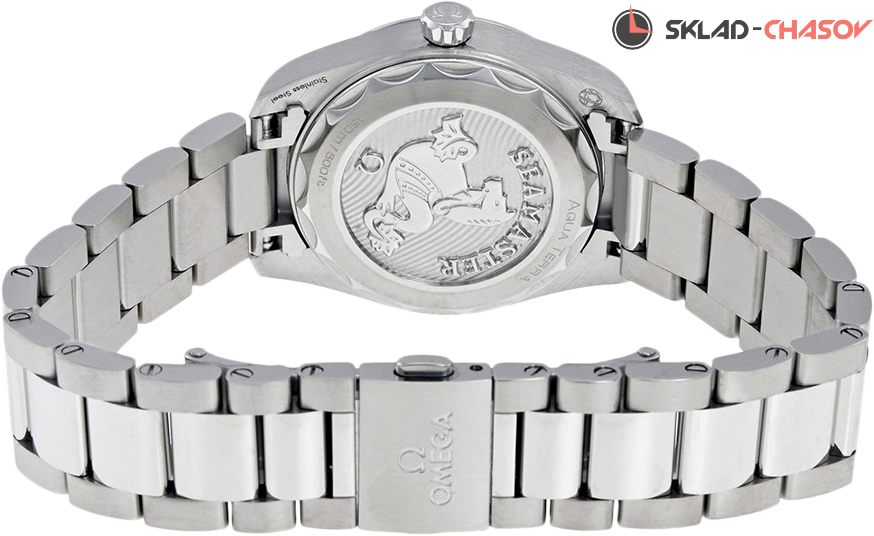 Элегантная женская модель, циферблат украшен 4 бриллиантами, задняя крышка с тисненым изображением морского конька OMEGA на фоне волн.