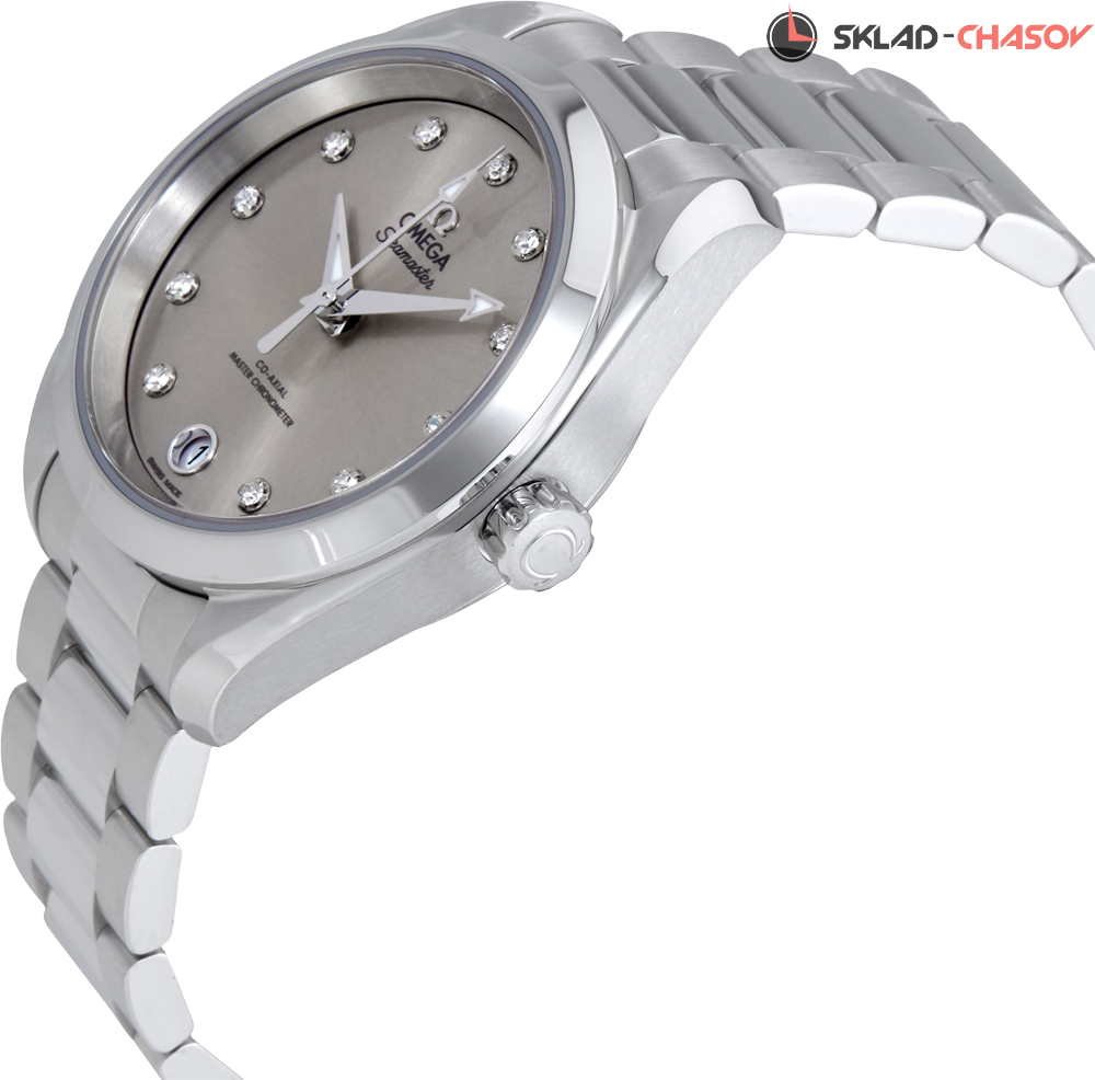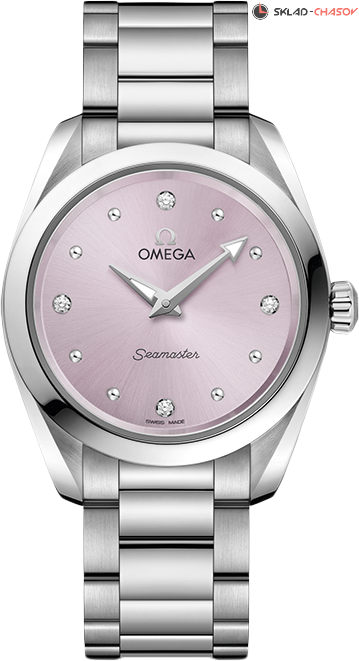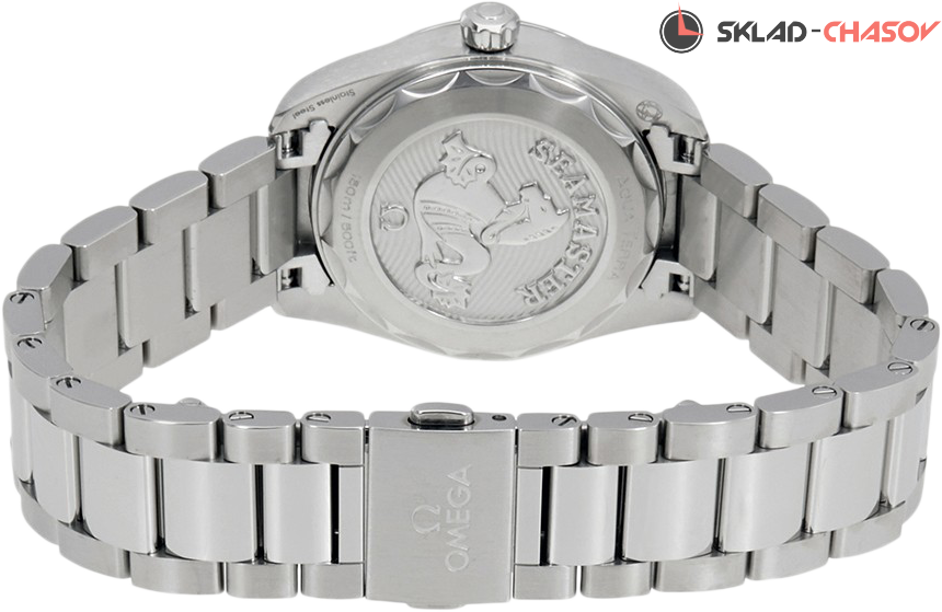 Элегантная женская модель, циферблат украшен 4 бриллиантами, задняя крышка с тисненым изображением морского конька OMEGA на фоне волн.