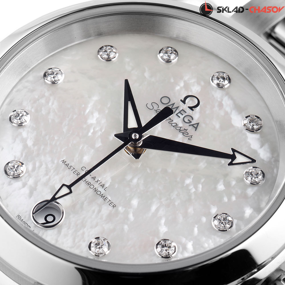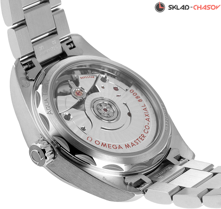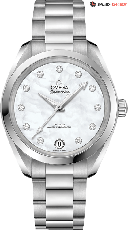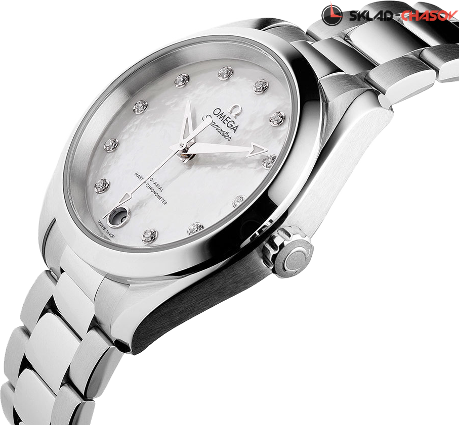 Omega Seamaster Aqua Terra выполнены в симметричном корпусе из нержавеющей стали с завинчивающейся задней крышкой, украшенной волновым узором. Циферблат дополнен окошком даты на 6 часах и 11 бриллиантами, установленными в родиевые держатели — деталь, подчёркивающая женственность и роскошь модели. Циферблат изготовлен из перламутрового материала с переливающейся текстурой, а стрелки и метки выполнены из белого золота. Калибр Omega 8800 сертифицирован как Master Chronometer — гарантия высочайшей точности и устойчивости к магнитным полям. Запас хода составляет 55 часов. Защиту циферблата обеспечивает сапфировое стекло с антибликовым покрытием с обеих сторон. Водозащита позволяет использовать часы в воде без риска повреждения. Часы установлены на интегрированный стальной браслет. Это сочетание премиального качества, технологичности и классического дизайна.