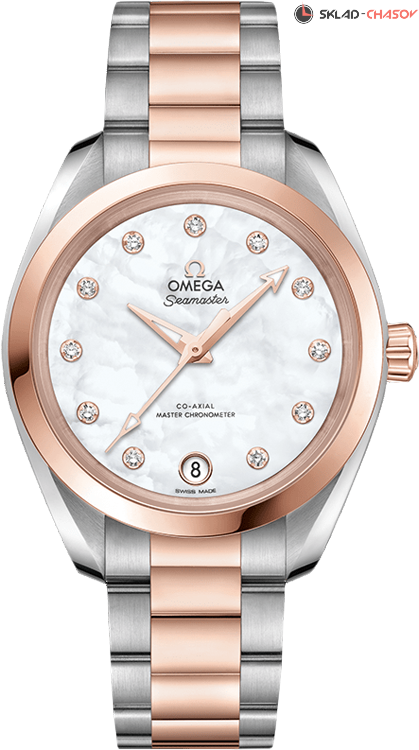 Omega Seamaster Aqua Terra выполнены в симметричном корпусе из нержавеющей стали и 18K Sedna™ золота с завинчивающейся задней крышкой, украшенной волновым узором. Циферблат дополнен окошком даты на 6 часах и 11 бриллиантами, установленными в держатели из 18K Sedna™ золота — деталь, подчёркивающая женственность и роскошь модели. Циферблат белого цвета изготовлен из перламутрового материала с переливающимся эффектом. Стрелки и метки выполнены из 18K Sedna™ золота. Калибр Omega 8800 сертифицирован как Master Chronometer — гарантия высочайшей точности и устойчивости к магнитным полям. Запас хода составляет 55 часов. Защиту циферблата обеспечивает сапфировое стекло с антибликовым покрытием с обеих сторон. Водозащита позволяет использовать часы в воде без риска повреждения. Часы установлены на интегрированный браслет из стали и 18K Sedna™ золота с раскладной застёжкой. Это сочетание премиального качества, технологичности и классического дизайна.