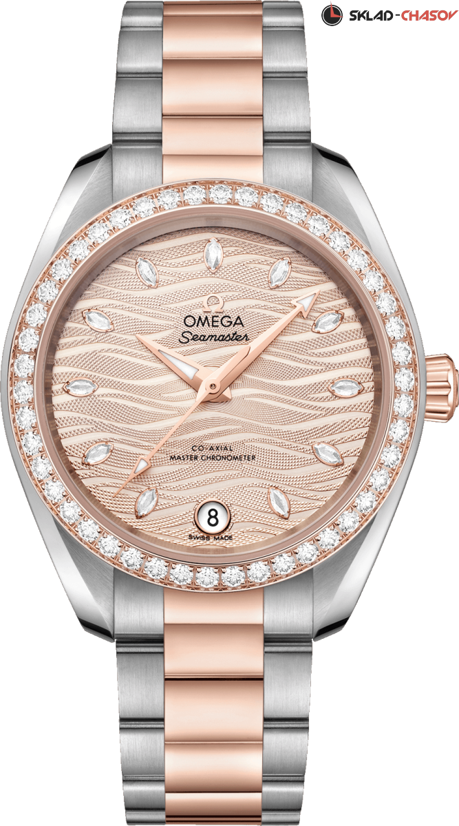 Часы Omega Seamaster Aqua Terra выполнены в симметричном корпусе из нержавеющей стали и 18K Sedna™ золота с завинчивающейся задней крышкой, украшенной волновым узором. Циферблат золотистого цвета дополнен окошком даты на 6 часах и 11 индексами в виде маркиз, установленными по центру. Часовые стрелки и секундная стрелка выполнены из 18K Sedna™ золота с алмазной полировкой для высокой контрастности. Калибр Omega 8800 сертифицирован как Master Chronometer — гарантия высочайшей точности и устойчивости к магнитным полям. Запас хода составляет 55 часов. Защиту циферблата обеспечивает сапфировое стеклоСапфировое стеклоПрочный и надёжный материал из кристалла сапфира синтетического происхождения, характеризующийся особой твёрдостью и устойчивостью к царапинам и повреждениям. с антибликовым покрытиемАнтибликовое покрытиеСлой оксида металла в 0,13-0,3 микрон, благодаря которому стекло часов не бликует и не отражает свет. Антибликовое покрытие уменьшает отражение света в 10 раз, обеспечивая отличную читаемость показателей циферблата. с обеих сторон. Водозащита позволяет использовать часы в воде без риска повреждения. Часы установлены на браслет из нержавеющей стали и 18K Sedna™ золота с застёжкой-бабочкой с кнопкамиЗастёжка "бабочка"Такой вид застёжки дополняется предохранителями, помогающими избежать случайного раскрытия браслета. Обладают изящным исполнением. . Вес модели — около 108 грамм. Это сочетание премиального качества, технологичности и классического дизайна.