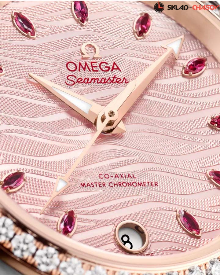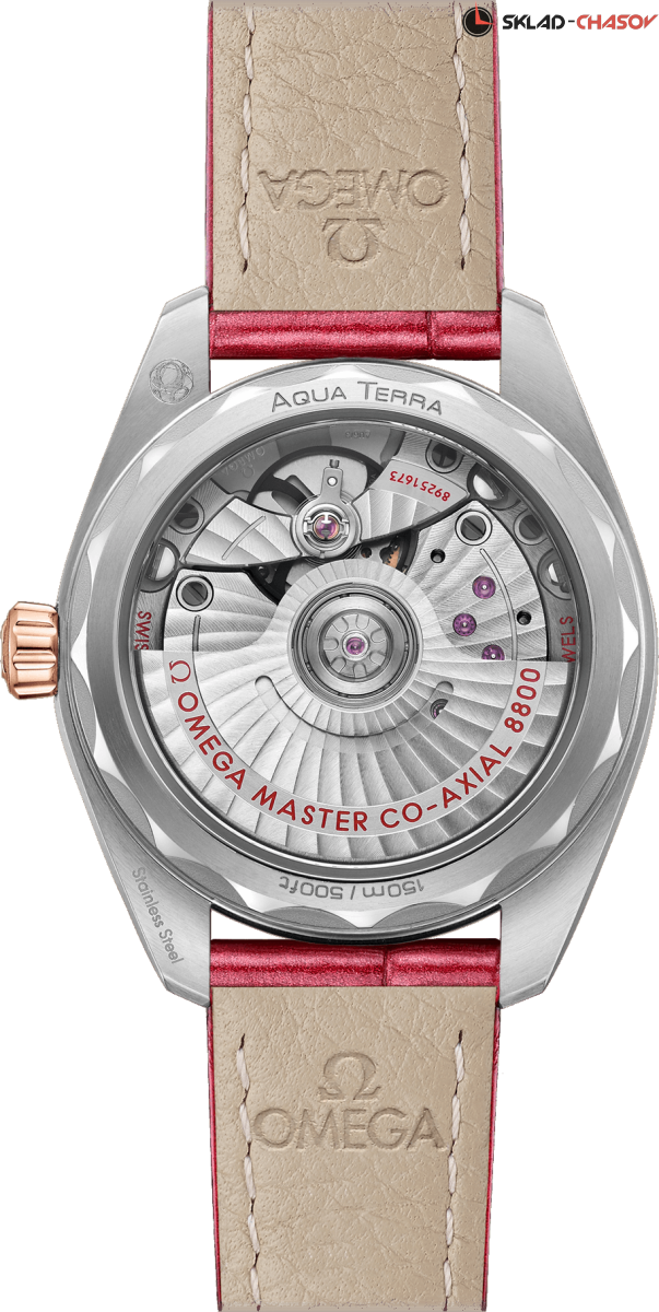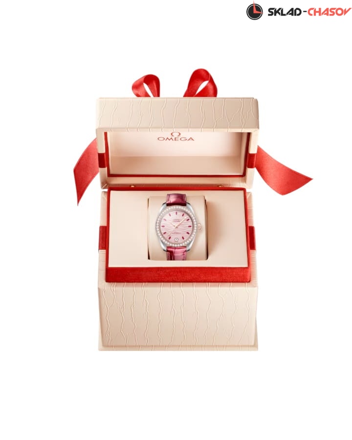 Женские часы Omega Seamaster Aqua Terra выполнены в симметричном корпусе из нержавеющей стали и 18K Sedna™ золота с завинчивающейся задней крышкой, украшенной волновым узором. Безель полированный и инкрустирован бриллиантами, что подчеркивает их роскошный дизайн. Циферблат нежно-розового цвета имеет текстуру в виде волн, окошко даты на 6 часах и 11 часовых меток в виде рубинов маркизной огранки. Стрелки выполнены из 18K Sedna™ золота с алмазной полировкой и оснащены люминесцентным покрытиемЛюминесцентное покрытиеПозволяет считывать показания времени в темноте. Производители наносят на стрелки, часовые индексы, безель или поверхность циферблата светонакопительный состав, дающий холодное свечение. для лучшей читаемости в темноте. Калибр Omega 8800 сертифицирован как Master Chronometer — гарантия высочайшей точности и устойчивости к магнитным полям. Запас хода составляет 55 часов. Защиту циферблата обеспечивает сапфировое стеклоСапфировое стеклоПрочный и надёжный материал из кристалла сапфира синтетического происхождения, характеризующийся особой твёрдостью и устойчивостью к царапинам и повреждениям. с антибликовым покрытиемАнтибликовое покрытиеСлой оксида металла в 0,13-0,3 микрон, благодаря которому стекло часов не бликует и не отражает свет. Антибликовое покрытие уменьшает отражение света в 10 раз, обеспечивая отличную читаемость показателей циферблата. с обеих сторон. Водозащита позволяет использовать часы в воде без риска повреждения. Часы установлены на кожаный ремешок красного цвета. Вес модели — около 65 грамм. Это сочетание премиального качества, технологичности и классического дизайна.